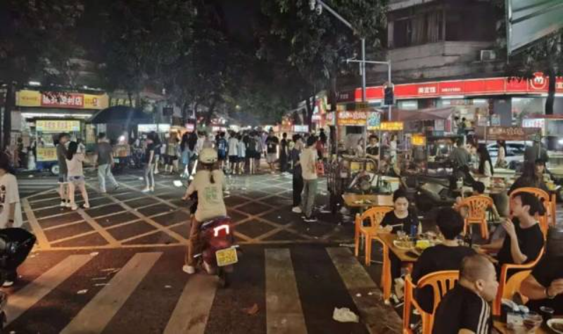 针对原北郊夜市占道经营、油烟弥漫、污渍满地、垃圾成堆等问题,环市街道联合摩创园方在“环境提升”上精准发力:统一加装高效排烟系统,有效减少油烟扩散;科学划分用餐区域并配备舒适桌椅,让食客们从“蹲在路边吃”升级为“坐享美食”;增配10余名专职保洁人员及时清扫垃圾,有效提高“翻桌率”;安排10余名安保人员巡逻引导,确保人流有序流动不扎堆。