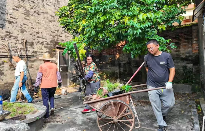 “这老房子清干净以后还挺好看的,搭配着旁边的柿子树,就像一幅画!”站在蓬江区棠下镇周郡村东风村小组刚清理完的闲置青砖屋前,村民陈艳勤笑着竖起了大拇指,这座曾堆满垃圾杂物的老屋,如今终于显露出清爽的面貌。