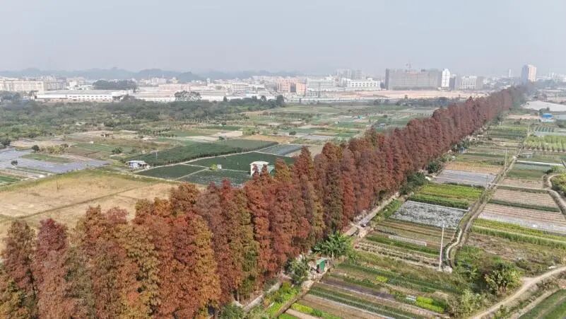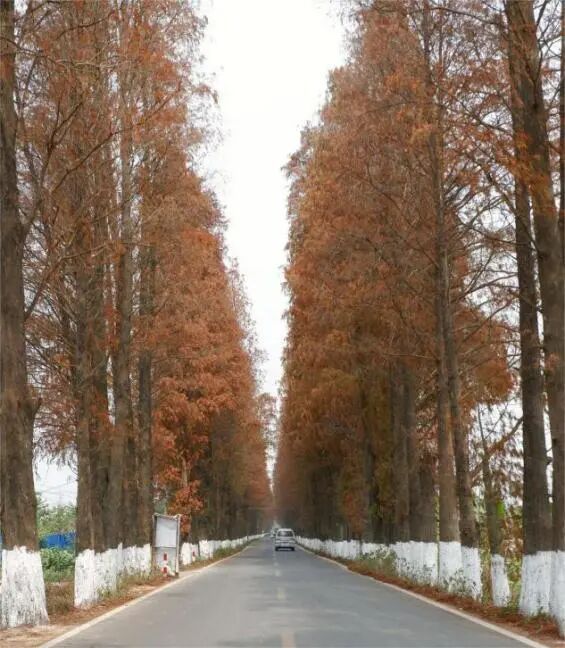 沿着Y166乡道驶入乐溪村,最先迎接您的是公坑寺前那排排挺拔的落羽杉。它们已悄然换上红装,在冬日暖阳下,勾勒出一条绝美的红色廊道。