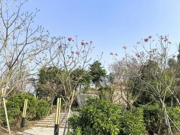 一团团、一簇簇浅粉或深紫的花团在五洞小公园正在悄然盛放,在冬日的蓝天的衬托下,显得格外俏丽多姿。近年来,五洞村积极响绿美广东生态建设口号,全力推荐绿美乡村建设,陆续盛放的紫花风铃木见证五洞村推进全域绿化建设的成效,让村庄面貌锦上添花。进入花期的紫花风铃木欢迎大家前来逛逛公园,拍照打卡。