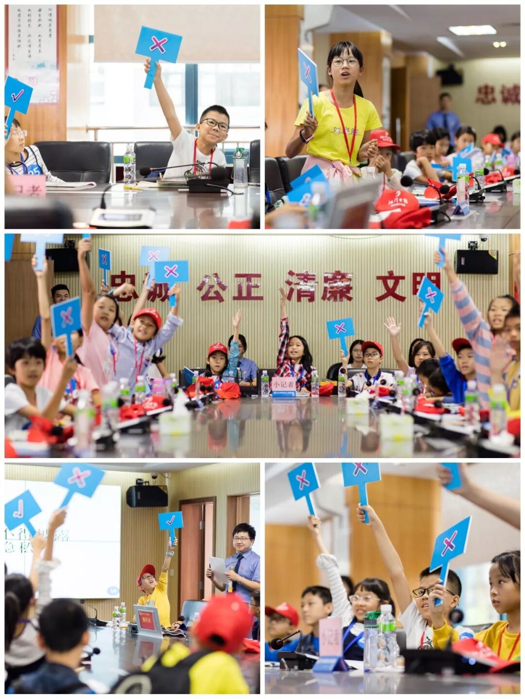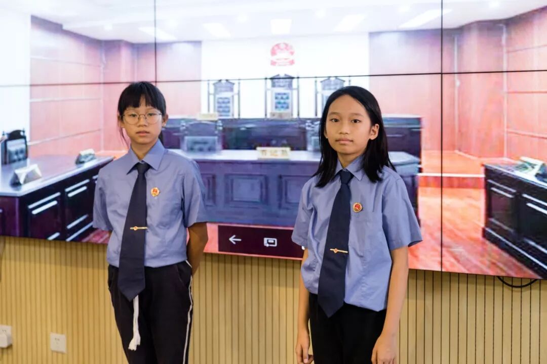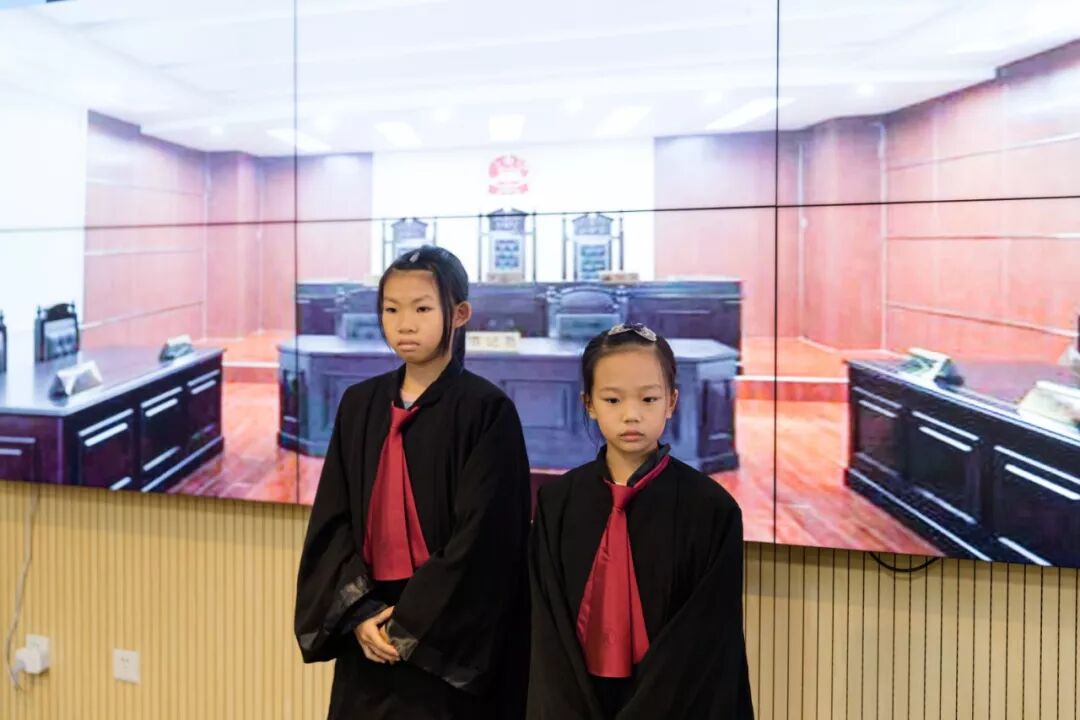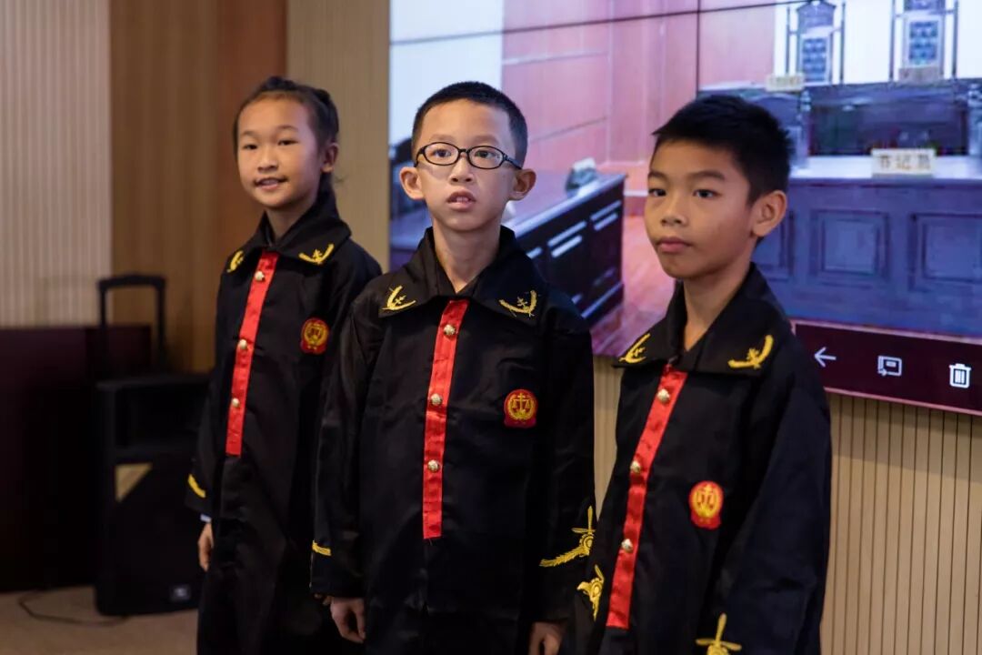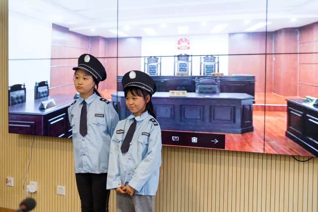 其中九名小记者还获得了“神秘大奖”---体验作为一名“庭审人员”,三名小记者身着小小法官袍组成“合议庭”、二名小记者身着检察官制服作为“公诉人”出庭公诉、二名小记者身着律师袍作为“辩护人”出庭辩护、二名小记者身着人民警察制服作为“法警”出庭维持秩序,为所有的小记者们展示了一场法庭人员角色图。