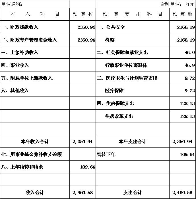 蓬江区人民检察院收入预算2460.58 万元,其中:公共财政预算收入2350.94万元,上年结转结余109.64万元。