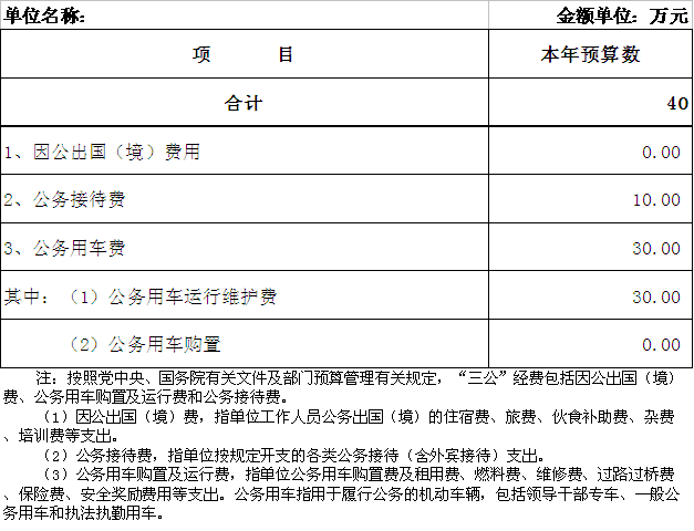 蓬江区人民检察院用财政拨款数开支的出国(境)经费、车辆购置及运行费、公务接待费(简称“三公”经费)支出合计40万元。