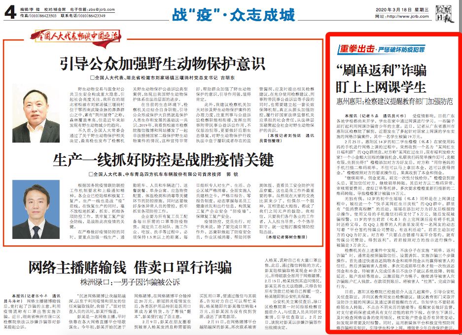 3月18日,检察日报报道《“刷单返利”诈骗 盯上上网课学生》,文章介绍广东惠阳检察机关提前介入案件,并通过检察建议提醒教育部门加强防范,严惩破坏防疫犯罪。