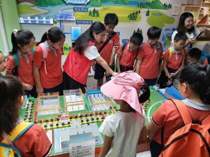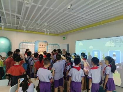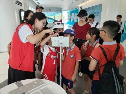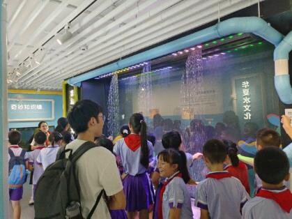 在蓬江区智水展示中心,少年学生们跟随工作人员先后参观了展馆二楼智水综合展厅和一楼环保教育展厅,通过听取介绍和沉浸体验的方式深入了解江门市和蓬江区治水历程、水系情况、水治理情况等,系统学习了水环境知识、城市水循环、环境保护等等方面的知识。