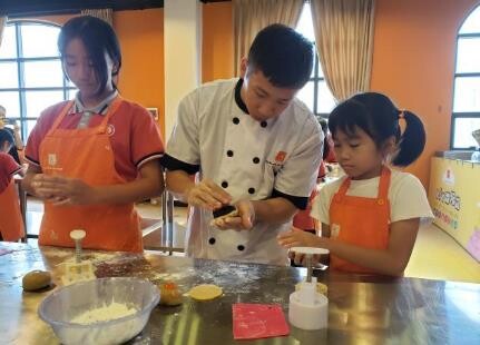 在东望洋(江门)食品科普基地,全国博士后创新(江门)示范中心的高层次人才代表和少年学生们进行了中秋节由来及月饼分类等传统文化知识分享,大家还一起参观了企业展厅和生产车间,在烘焙制作室跟随糕点师傅的教学进行了月饼手工制作。