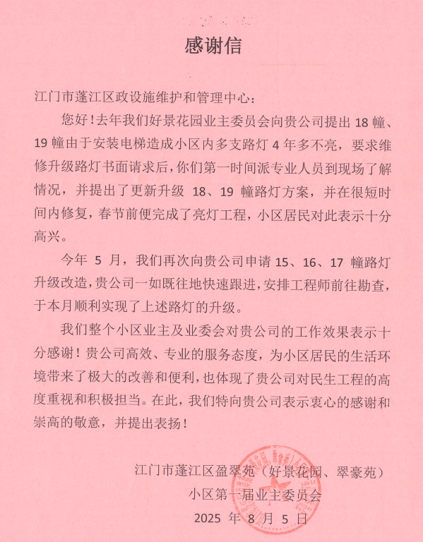 “政府真心办实事,这盏灯照亮的不止是回家的路,更是咱老百姓的心!”近日,蓬江区盈翠苑等小区居民代表莫叔和梁叔手持感谢信,纸短情长,感谢该局为民办实事、解民忧,高效解决小区百余户居民夜间安全出行难题。这既是群众对城管工作的肯定,更彰显政府部门对民生工程的高度重视与主动担当,始终把群众的“急难愁盼”放在心上、抓在手上,用实实在在的举措把民生实事办进群众心坎里,生动践行“人民城市为人民”的发展思想。