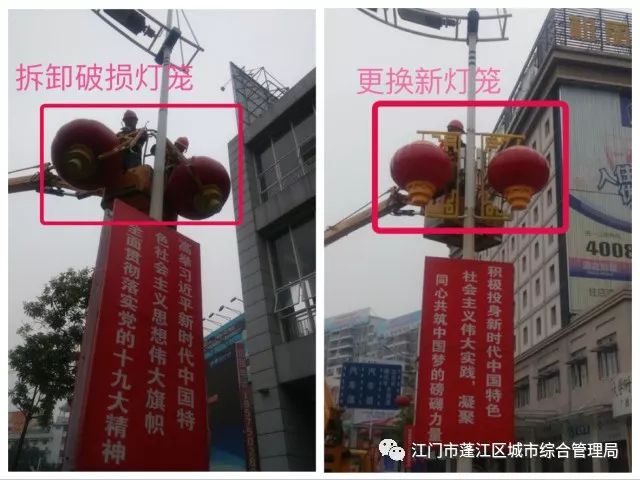 蓬江区城管局加强景观灯饰巡查维护管养力度,对原有的26条道路(街旁公园)和4座桥梁景观灯饰进行检修更换,重点对蓬江大桥灯饰、丰乐路杜鹃花、白石大道庭院灯进行补充更换,确保节日期间正常亮灯。