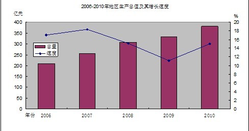 初步核算,2010年全区生产总值(GDP)380.53亿元,按可比价格计算,比上年增长15%。其中,第一产业增加值7.22亿元,下降0.2%;第二产业增加值211.34亿元,增长17.6%,对GDP贡献率为68.15%;第三产业增加值161.97亿元,增长11.8%,对GDP贡献率为31.88%。在第三产业增加值中,交通运输、仓储和邮政业增长7.8%,批发和零售业增长13.3%,住宿和餐饮业增长8.5%,金融业增长2.7%,房地产业增长3.9%,其他服务业增长15.47%。三产产业结构的比例为1.9:55.54:42.56。