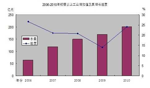 全年规模以上工业企业(年主营业务收入500万元及以上的工业法人企业,下同)755家。实现增加值201.56亿元,增长24.12%,其中轻工业增加值129.88亿元,增长20.77%;重工业增加值71.68亿元,增长30.8%。分经济类型看,国有及国有控股企业增长18.62%,集体企业增长36.76%,股份制企业增长38.14%,三资企业增长13.34%,民营企业增长39.66%。
