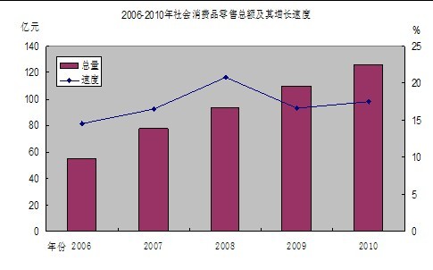 全年社会消费品零售总额126.09亿元,增长17.55%。分行业看,批发零售业零售额112.64亿元,增长17.68%;住宿和餐饮业零售额13.45亿元,增长16.41%。分地域看,城镇消费品零售总额111.99亿元,增长16.3%;农村消费品零售总额14.1亿元,增长28.51%。