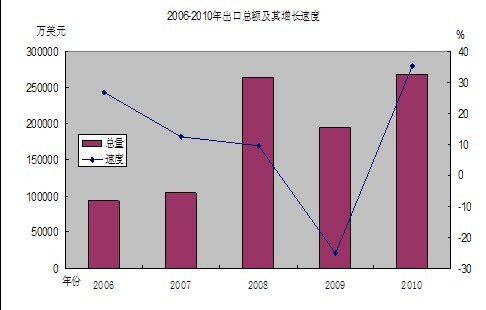全年进出口总额33.22亿美元,增长38.37%,其中,出口总额26.84亿美元,增长35.29%;进口总额6.37亿美元,增长53.02%。出口贸易中,一般贸易出口21.74亿美元,增长34.9%;加工贸易出口5.1亿美元,增长36.81%。从各种经济类型企业出口情况看,国有企业出口1042万美元,下降84.63%;三资企业出口8.74亿元,增长34.21%;私营企业出口18亿美元,增长42.27%。