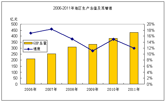 初步核算,2011年全区实现地区生产总值(GDP)430.85亿元,同比增长12%。其中,第一产业增加值9.46亿元;第二产业增加值248.34亿元,同比增长13.5%;第三产业增加值173.04亿元,同比增长10.5%。三次产业结构为2.2:57.64:40.16。在第三产业增加值中,批发和零售业增长21.2%,住宿和餐饮业增长6.2%,金融业下降0.9%,房地产业下降1.9%,其他服务业增长15.1%。人均GDP 59749元,增长9.3%。