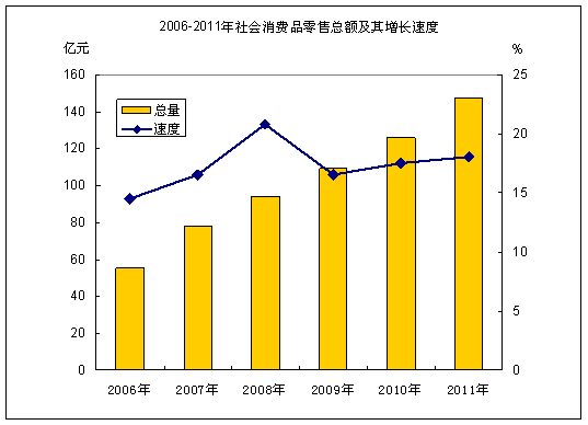 全年社会消费品零售总额147.72亿元,比上年增长18.05%。分行业看,批发零售业零售额134.61亿元,增长19.06%;住宿和餐饮业零售额13.11亿元,增长8.54%。分地域看,城镇消费品零售总额126.56亿元,增长16.77%;农村消费品零售总额21.16亿元,增长26.3%。