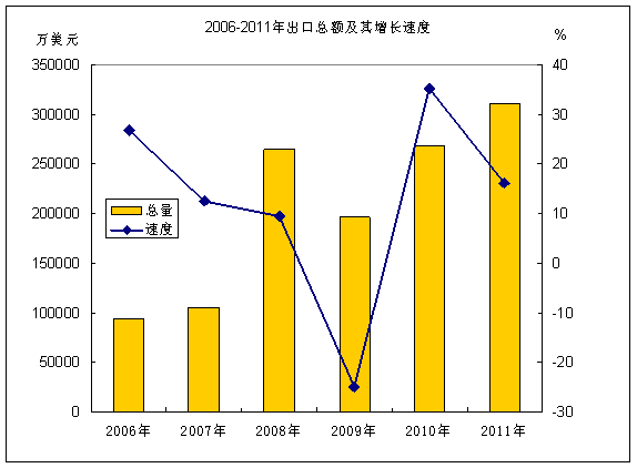 全年进出口总额386272 万美元,比上年增长16.83%,其中,进口总额74942万美元,增长20.14 %;出口总额311330万美元,增长16.06 %。出口贸易中,一般贸易出口 262869万美元,增长21.03 %;加工贸易出口48171万美元,下降 5.52 %。从各种经济类型企业出口情况看,国有企业出口988万美元,下降 36.23%;三资企业出口68668万美元,增长15.89%;私营企业出口41184万美元,增长14.92%。