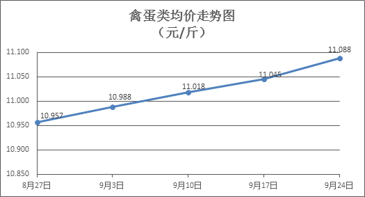 禽蛋类商品价格略有上涨。上周所监测的6种禽蛋类商品价格波动情况为5涨1平,综合零售均价为11.088元/斤,环比上涨0.39%。其中:白条鸡、白条鸭零售均价分别为每斤19.68元、15.88元,环比分别上涨0.36%、上涨0.89%;白壳鸡蛋、鸭蛋零售均价分别为每斤6.90元、7.94元,环比分别上涨0.29%、上涨0.13%。