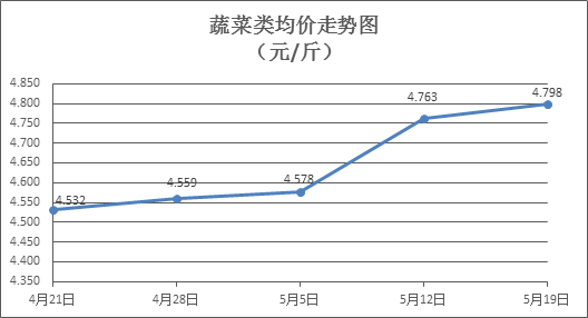 蔬菜类商品价格窄幅盘整。所监测的32 种蔬菜商品价格波动情况为18涨13跌1平,综合零售均价为每斤4.798元,环比上涨0.73%。其中:涨幅居前的品种包括西洋菜、花菜、西红柿,零售均价分别为每斤4.24元、5.54元、4.73元,环比分别上涨13.37%、7.99%、5.82%;跌幅靠前的品种包括白苋菜、丝瓜、黄瓜,零售均价分别为每斤4.52元、4.76元、3.48元,环比分别下降5.44%、3.84%、3.33%。