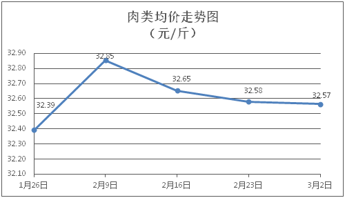 肉类商品价格总体微降。所监测的8种肉类商品价格波动情况为1涨5跌2平,综合零售均价为每斤32.57元,环比下降0.05%。其中:排骨、精瘦肉、肋条肉、牛肉、带骨羊肉零售均价分别为每斤31.49元、19.73元、16.69元、46.59元、41.38元,环比分别下降0.35%、持平、下降1.07%、持平、上涨0.72%。