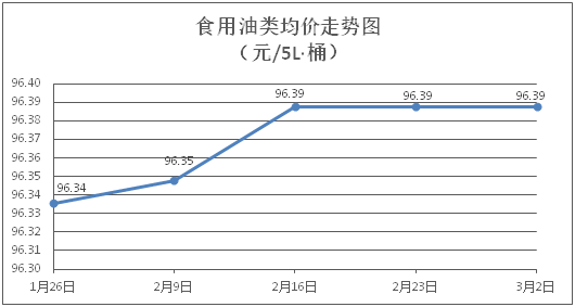 食用油类商品价格基本平稳。所监测的9种食用油(5L装)商品价格均持平,综合零售均价为每桶96.39元。其中:鲁花花生油、金龙鱼调和油零售均价为每桶156.04元、72.00元,环比均持平。
