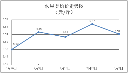 水果类商品价格小幅波动。所监测的6种水果商品价格波动情况为3涨1跌2平,综合零售均价为每斤6.54元,环比下降0.41%。其中苹果、葡萄、西瓜零售均价分别为每斤7.49元、13.73元、3.47元,环比分别上涨0.13%、上涨0.37%、下降6.47%。