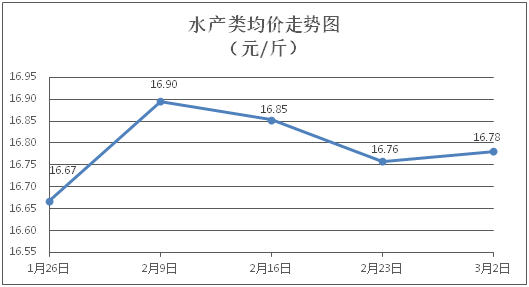 水产类商品价格弱势盘整。所监测的9种水产商品价格波动情况为2涨4跌3平,综合均价为每斤16.78元,环比上涨0.14%。其中:草鱼、鲫鱼、鳙鱼、罗非鱼、基围虾零售均价分别为每斤11.07元、14.30元、10.82元、9.13元、30.07元,环比分别下降0.18%、下降0.14%、上涨0.28%、下降0.65%、下降0.07%。