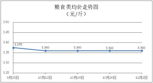 粮食类商品价格保持稳定。所监测的4种粮食类商品价格均持平,综合零售均价为每斤3.360元。其中:丝苗米、面粉零售均价分别为每斤3.51元、3.32元,环比均持平。