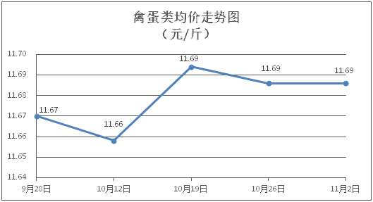禽蛋类商品价格走势较稳。所监测的5种禽蛋类商品价格均持平,综合零售均价为每斤11.69元。其中:白条鸡、白条鸭零售均价分别为每斤20.88元、15.20元,环比均持平;鸡蛋、鸭蛋零售均价分别为每斤6.39元、7.07元,环比均持平。