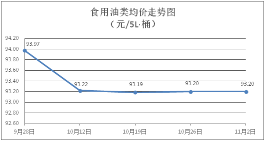 食用油类商品价格平稳。所监测的9种食用油(5L装)商品价格均持平,综合零售均价为每桶93.20元。其中:金龙鱼花生油、金龙鱼调和油零售均价分别为每桶100.65元、70.57元,环比均持平。