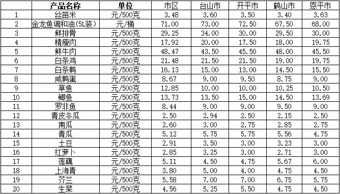 说明:1、表中价格为该地区监测点上周综合平均价;2、“市区”含蓬江区、江海区、新会区,价格分别采自蓬江市场、江南市场、城东市场等13家农贸市场;3、其他四个县市价格分别采自新华市场、锦江市场等8家农贸市场。