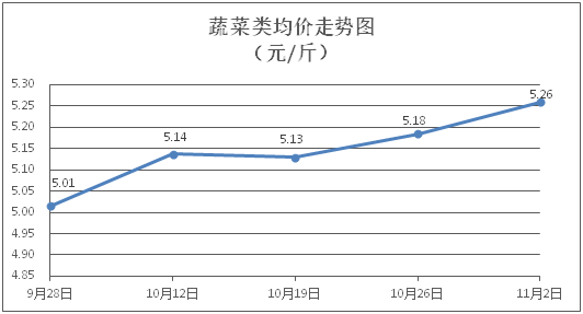 蔬菜类商品价格小幅上涨。所监测的32 种蔬菜商品价格波动情况为24涨6跌2平,综合零售均价为每斤5.26元,环比上涨1.42%。其中:涨幅居前的品种包括菠菜、黄瓜、白萝卜,零售均价分别为每斤8.17元、5.31元、2.38元,环比分别上涨7.08%、6.84%、3.48%;跌幅靠前的品种为白苋菜、青皮冬瓜、土豆,零售均价分别为每斤4.98元、2.51元、3.06元,环比分别下降1.97%、1.95%、0.65%。