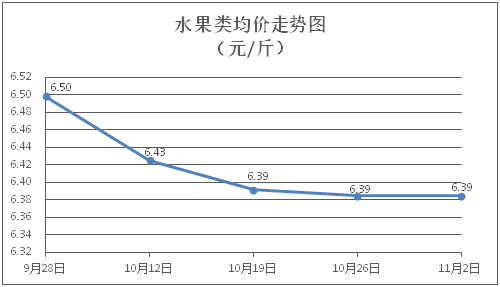 水果类商品价格微幅波动。所监测的6种水果商品价格波动情况为3涨2跌1平,综合零售均价为每斤6.39元,环比持平。其中橙子、苹果、西瓜零售均价分别为每斤7.34元、7.99元、3.20元,环比分别下降0.14%、上涨0.13%、上涨0.31%。