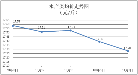 水产类商品价格总体略降。所监测的9种水产商品价格波动情况为3涨6跌,综合均价为每斤17.28元,环比下降0.65%。其中:草鱼、鳙鱼、罗非鱼、基围虾零售均价分别为每斤11.33元、10.54元、8.83元、28.41元,环比分别上涨0.18%、下降0.66%、上涨0.11%、下降1.93%。