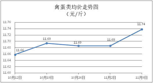 禽蛋类商品价格微幅上涨。所监测的禽蛋类商品价格波动情况为4涨1跌,综合零售均价为每斤11.74元,环比上涨0.44%。其中:白条鸡、白条鸭零售均价分别为每斤20.92元、15.27元,环比分别上涨0.19%、上涨0.46%;鸡蛋、咸鸭蛋零售均价分别为每斤6.38元、8.93元,环比分别下降0.16%、上涨0.45%。