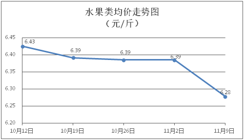 水果类商品价格小幅下降。所监测的水果商品价格波动情况为2涨4跌,综合零售均价为每斤6.28元,环比下降1.67%。其中橙子、苹果、西瓜零售均价分别为每斤6.80元、7.96元、3.22元,环比分别下降7.36%、下降0.38%、上涨0.63%。