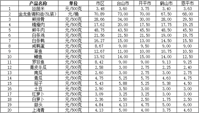 说明:1、表中价格为该地区监测点上周综合平均价;2、“市区”含蓬江区、江海区、新会区,价格分别采自蓬江市场、江南市场、城东市场等13家农贸市场;3、其他四个县市价格分别采自新华市场、锦江市场等8家农贸市场。