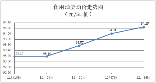 食用油类商品价格稳中略涨。所监测的食用油(5L装)商品价格波动情况为1涨2跌6平,综合零售均价为每桶94.25元,环比上涨0.25%。其中:胡姬花花生油、玉米油零售均价分别为每桶141.18元、75.99元,环比分别上涨1.89%、下降0.11%。