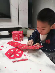 ▲培英小学二年级学生孟禹利制作灯笼迎新年