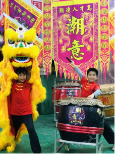 ▲潮连街永思小学学生谭泳茵(左)练习“舞狮”迎接新年