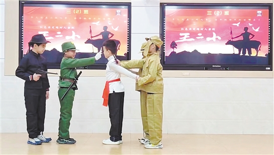 江门日报讯 (文/图 记者/潘诗欣 通讯员/陈淑晶) “牛啊牛啊吃青草,二小我呀来放哨”“我要坚守岗位,提高警惕”……近日,在蓬江区棠下镇桐井小学举办的影视思政系列活动中,三(2)班带来节目《王二小》,精彩的表演让观众们沉浸在跌宕起伏的剧情中,无法挪开眼睛。