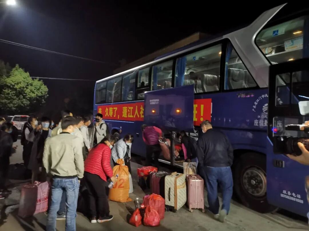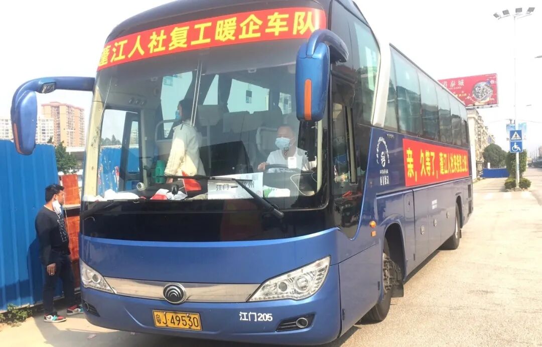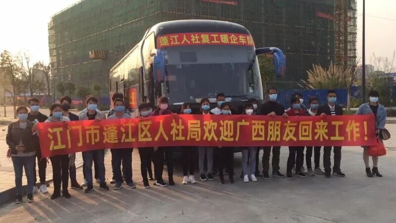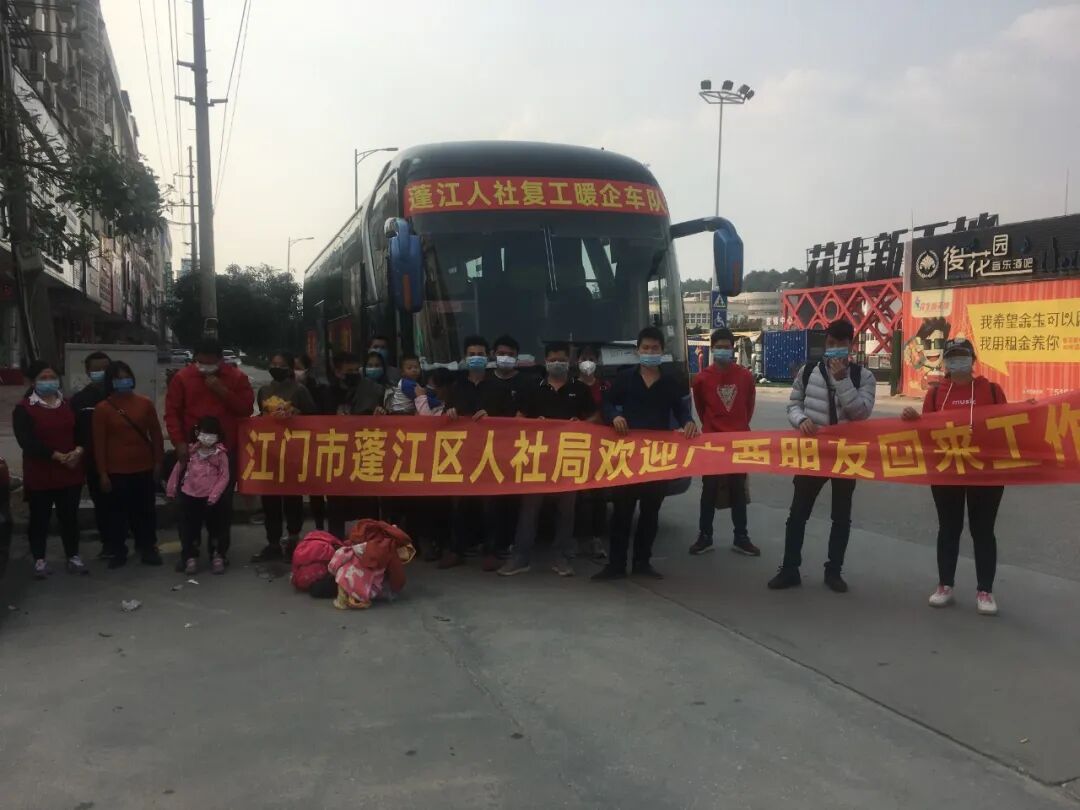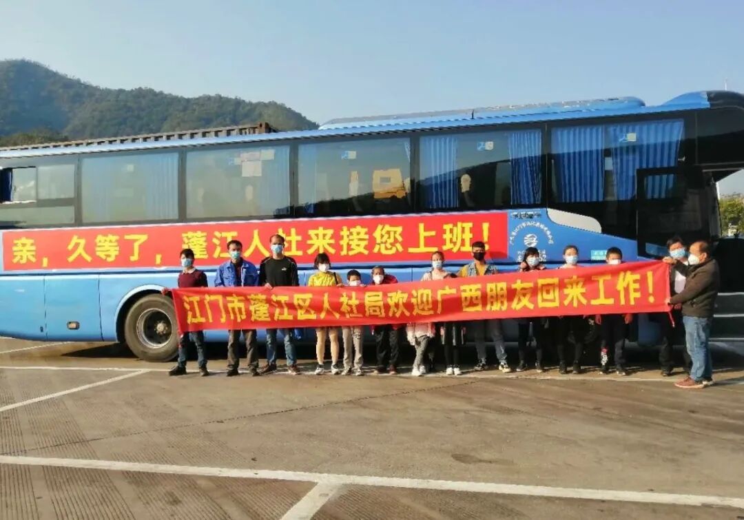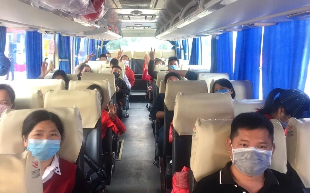 2月22日5点,首批5辆大巴顺利从江门出发,分别前往广西贵港平南县、桂平市、梧州苍梧县、桂林灵山县、百色靖西县、乐业县等地,接送约120名员工返岗。22日当晚,共有4辆专车100余名员工到达蓬江,次日另2辆专车约50名员工也陆续到达蓬江。