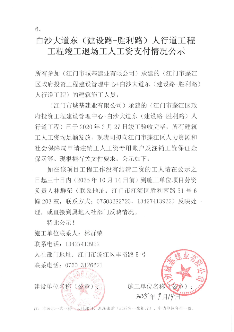 现将白沙大道东(建设路—胜利路)人行道工程项目《工程竣工退场工人工资支付情况公示》挂网公示如下,如发现该项目存在欠薪等相关情况的,请在30日内,请携带相关佐证材料,到施工单位项目或者人社部门反映情况。