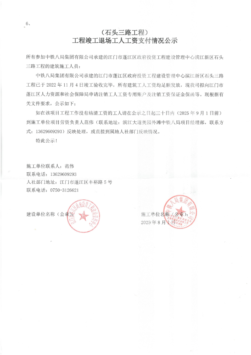 现将石头三路工程《工程竣工退场工人工资支付情况公示》挂网公示如下,如发现该项目存在欠薪等相关情况的,请在30日内,请携带相关佐证材料,到施工单位项目或者人社部门反映情况。