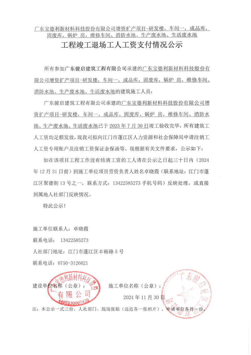 现将广东宝德利新材料科技股份有限公司增资扩产项目—研发楼,车间一、成品库,固废库、锅炉房、维修车间、消防水池、生产废水池、生活废水池工程《工程竣工退场工人工资支付情况公示》挂网公示如下,如发现该项目存在欠薪等相关情况的,请在30日内,请携带相关佐证材料,到施工单位项目或者人社部门反映情况。
