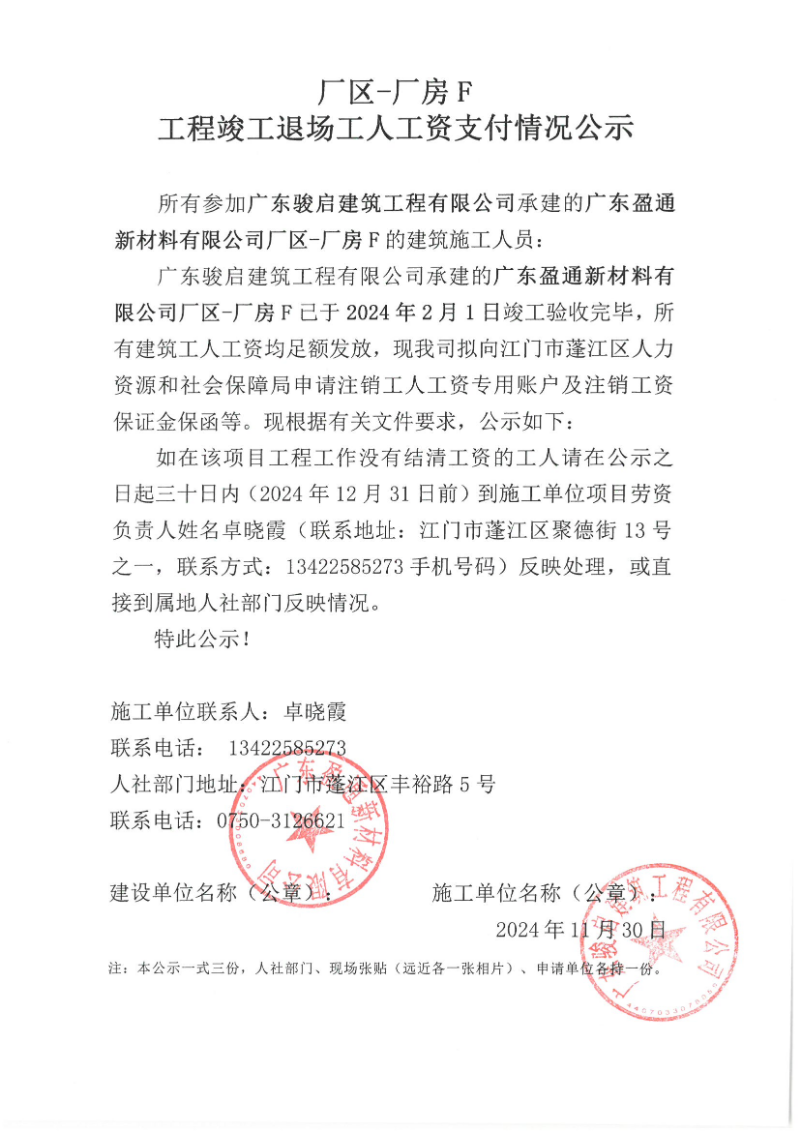 现将厂区—厂房F工程项目《工程竣工退场工人工资支付情况公示》挂网公示如下,如发现该项目存在欠薪等相关情况的,请在30日内,请携带相关佐证材料,到施工单位项目或者人社部门反映情况。