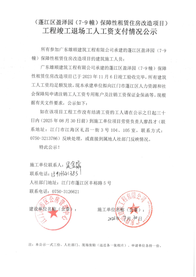 现将蓬江区盈泽园(7-9幢)保障性租赁住房改造项目《工程竣工退场工人工资支付情况公示》挂网公示如下,如发现该项目存在欠薪等相关情况的,请在30日内,请携带相关佐证材料,到施工单位项目或者人社部门反映情况。