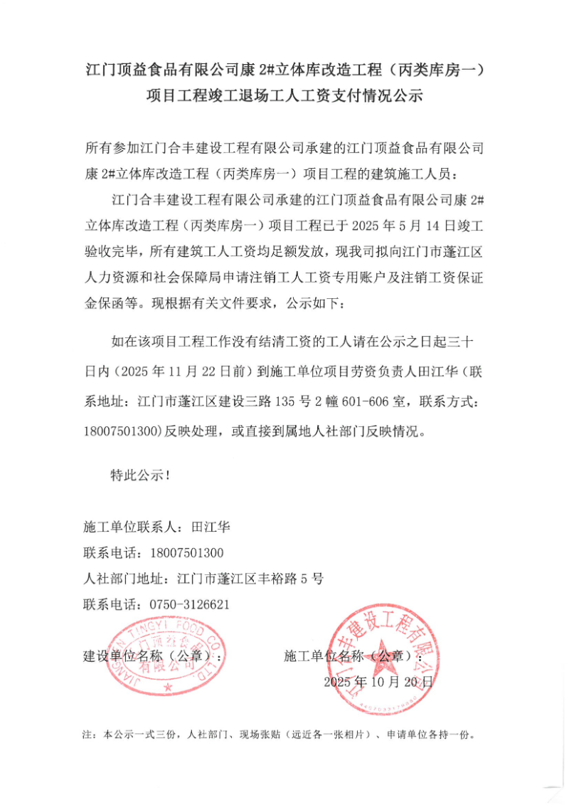 现将江门顶益食品有限公司康2#立体库改造工程(丙类库房一)工程项目《工程竣工退场工人工资支付情况公示》挂网公示如下,如发现该项目存在欠薪等相关情况的,请在30日内,请携带相关佐证材料,到施工单位项目或者人社部门反映情况。