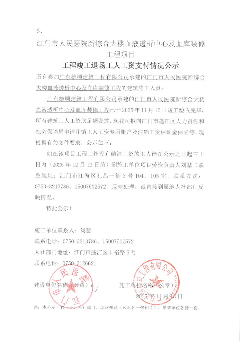 现将江门市人民医院新综合大楼血液透析中心及血库装修工程项目《工程竣工退场工人工资支付情况公示》挂网公示如下,如发现该项目存在欠薪等相关情况的,请在30日内,请携带相关佐证材料,到施工单位项目或者人社部门反映情况。