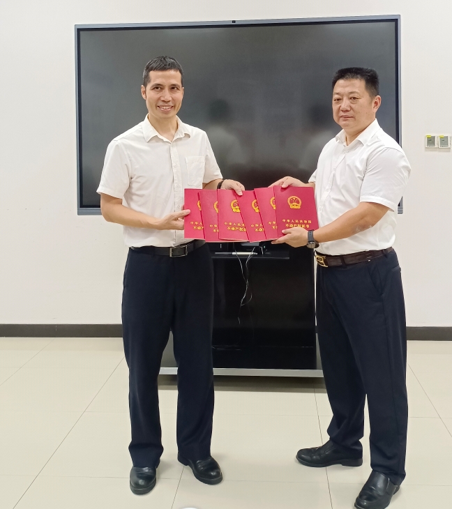 近日,在江门市不动产登记中心窗口处,6本红色崭新的《中华人民共和国不动产权证书》从窗口传递给蓬江区退役军人事务局时,现场响起阵阵掌声。蓬江区首批6处零散烈士纪念设施全部达到“红土”有证,这标志着蓬江区在烈士纪念设施保护工作上迈出了坚实的一步,不仅为烈士纪念设施提供了法律上的产权保障,也为今后在保护、管理和利用上奠定了更加坚实的基础。