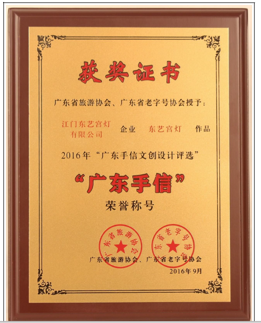2016年,东艺宫灯荣获“广东手信”荣誉称号。在2019年深圳文博会上,江门东艺宫灯公司送展的缅花红木宫灯作为广东省五项优秀展品之一,被广东省委宣传部、广东省文化和旅游厅选入1号馆广东展厅,同年,东艺宫灯参展“一带一路”国际手工艺展示,获得社会各界人的一致好评。