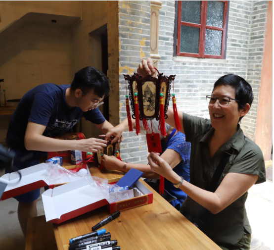 外国学者参与广东开平仓东村的非物质文化遗产活动,嘉宾现场组装宫灯。